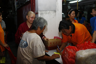 左图是本孤儿院院长阿尼耶喜卓瑪(ANI YESHE DOLMA)正向 DATO ROBIN 解说有关发放的意义。